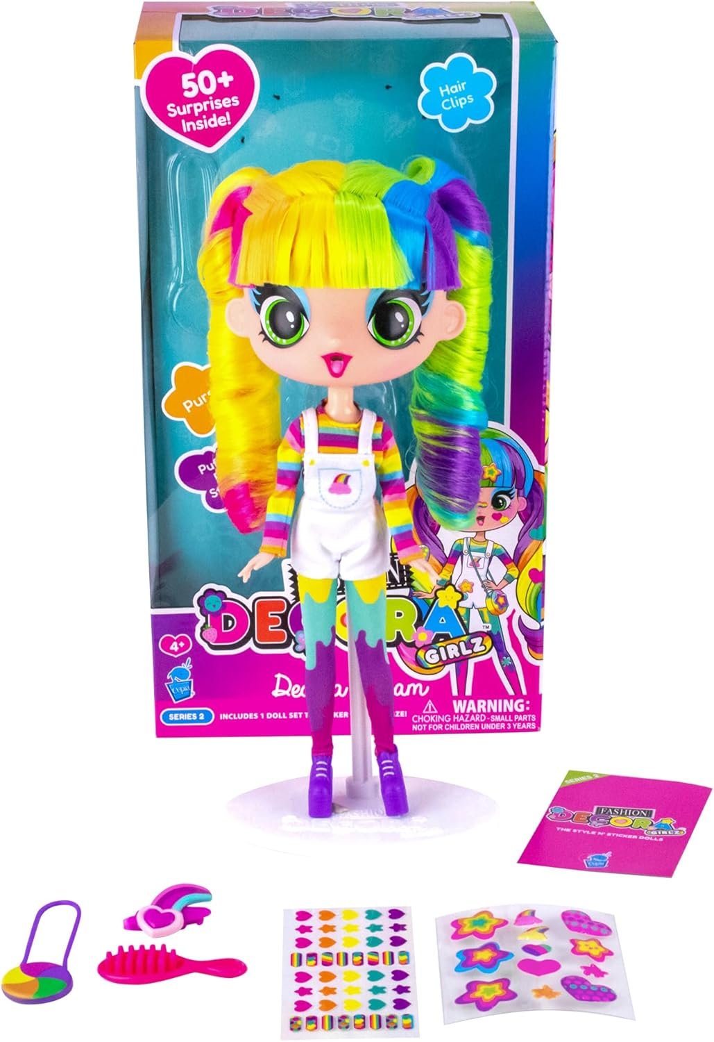 • Decora Fashion Girlz Series 2– Decora Dream – 11” Fabric-Costumed Posable Vinyl Doll with Extra-Long Rainbow Hair, 50+ Surprises, Puffy & Flat Removable Stickers, and Accessories